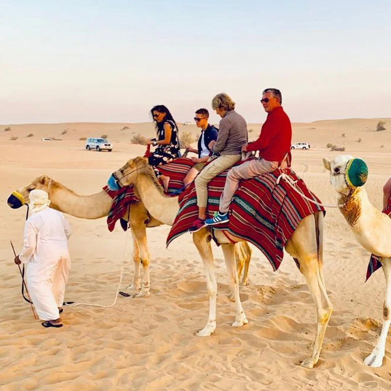 - Excursions: Dune bashing, Camel ride, Falcon photography